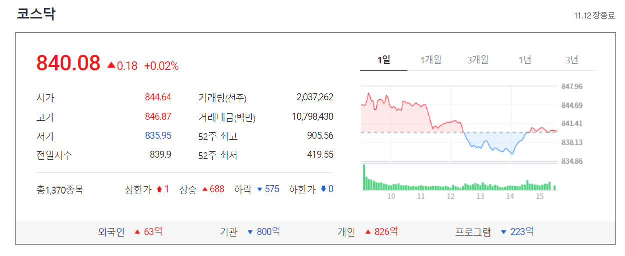 오늘 코스닥 시장은 어제 종가 대비 0.56% 상승 출발했으나 오후 들어 기관의 매도세에 하락 반전하다가 장 막판에 하락폭을 줄이면서 0.18포인트(0.02%) 오른 840.08에 장을 마쳤습니다.