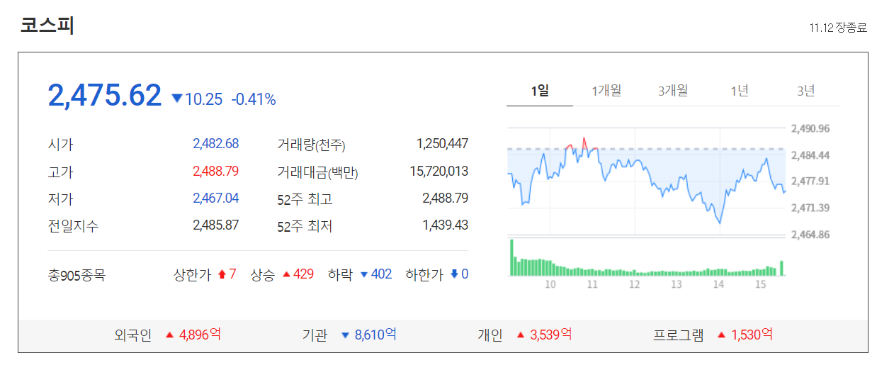 최근 급상승을 보였던 코스피는 오늘 10.25포인트(0.41%)하락한 2475.62에 장을 마감했습니다. 8 거래일 랠리 후 옵션만기일과 겹치면서 기관의 차익실현 매물이 나왔습니다. 수급면에서는 외국인과 개인이 각각 4896억, 3539억 원어치 순매수했고, 기관은 8610억 원어치 순매도했습니다.