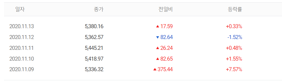 주식 마감 시황 및 전망(2020.11.13) 코스피 코스닥 해외증시 (1) | 2020.11.13 |