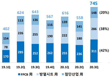 3분기 매출 기준으로는 FPCB가 42%, 방열시트가 38% 그리고 첨단산업 매출이 20%를 차지했습니다.