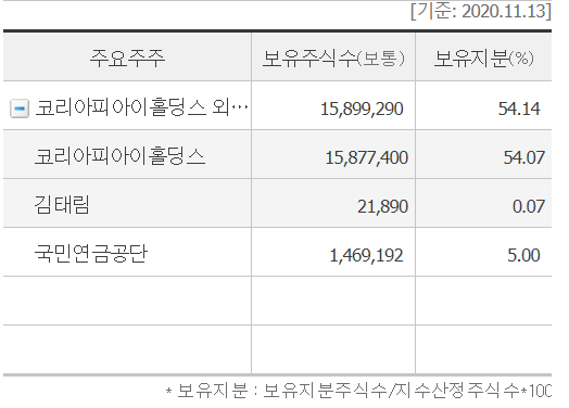 11월 13일 기준 최대주주인 코라이피아이홀딩스와 대표이사가 54.14% 의 주식을 보유하고 있고, 외국인 지분율은 7.69%, 국민연금공단이 5%를 각각 보유하고 있습니다.