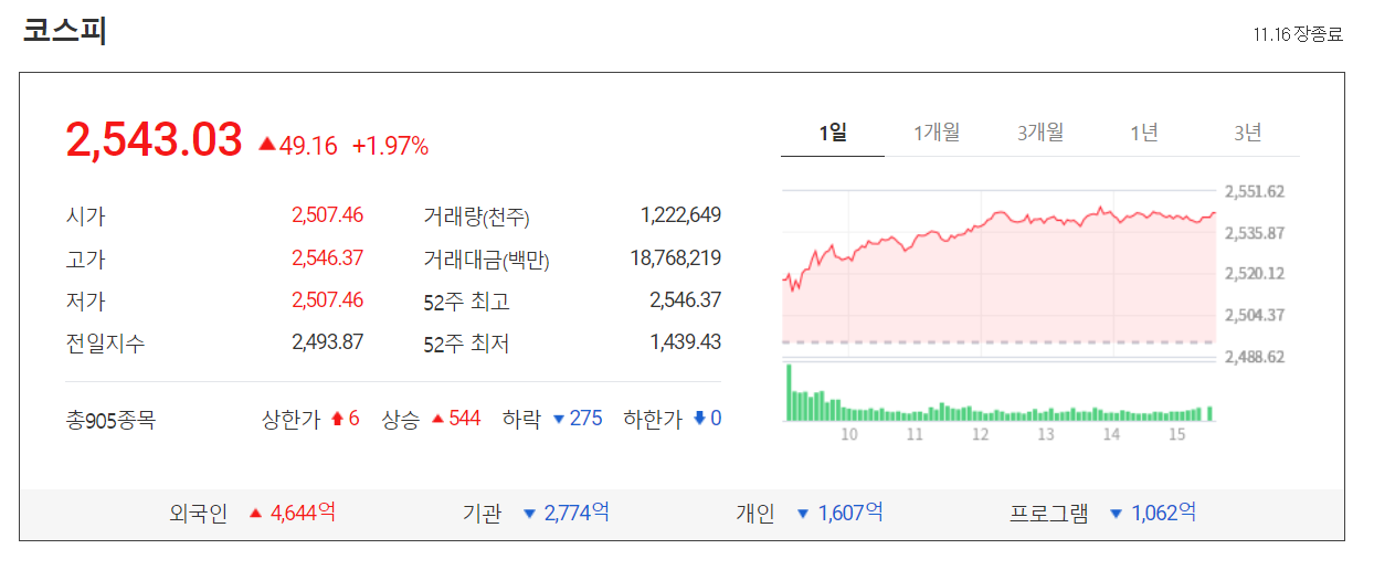 오늘 코스피는 전 거래일 대비 49.16포인트(1.97%)오른 2543.03에 거래를 마감했습니다. 특히 외국인의 8 거래일 연속된 매수세에 힘입어 2년 9개월 만에 2540선을 돌파했습니다.