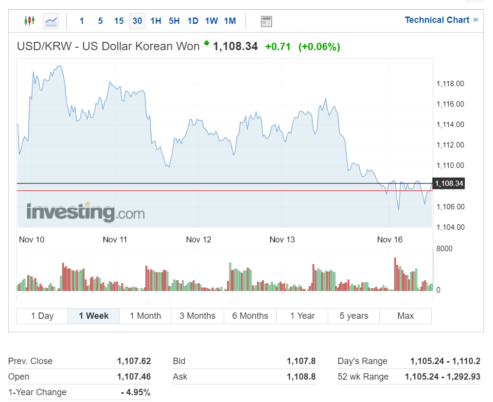 오늘 서울외한시장의 원달러 환율은 1110원대를 하향 돌파하면서 전 거래일 대비 0.45% 하락한 1108.50에 마감되었습니다. 현재 NDF 시장에서는 1108.34원을 기록 중입니다.