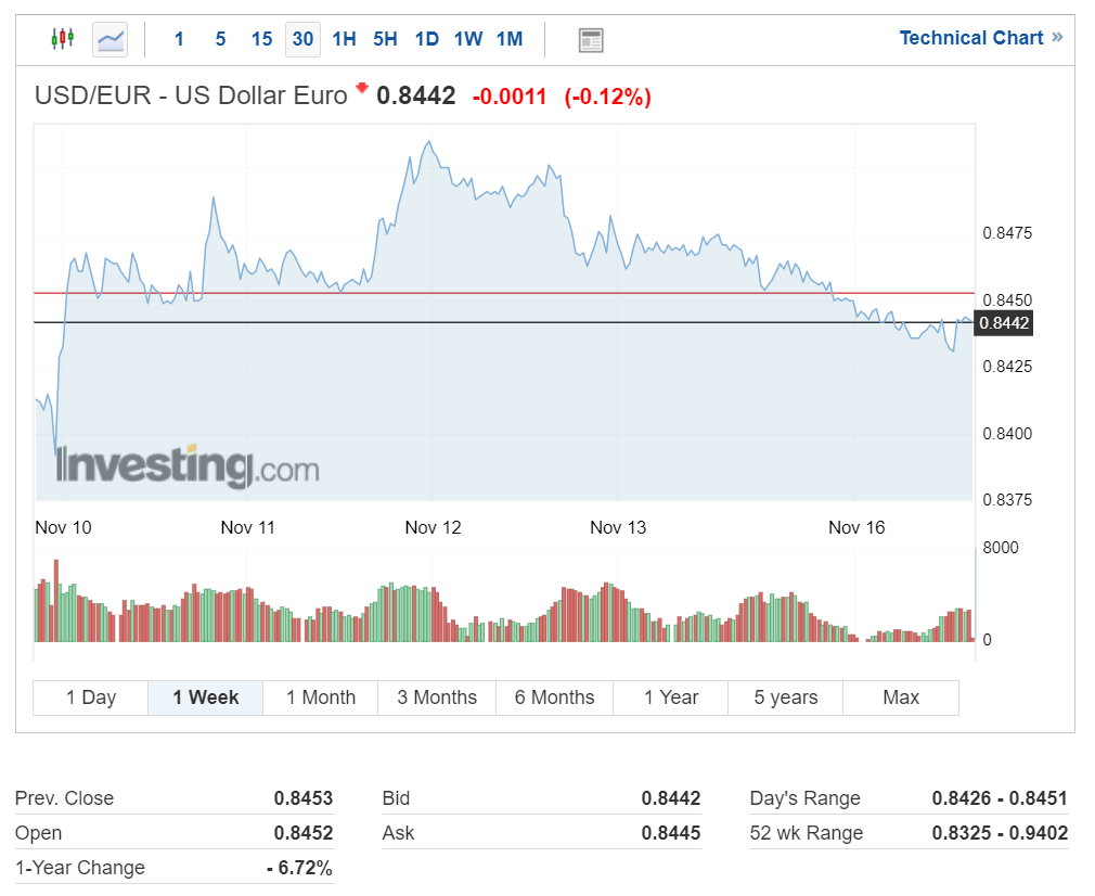 달러 대비 유로화 환율은 현재 1달러당 0.8442유로를 기록 중입니다.