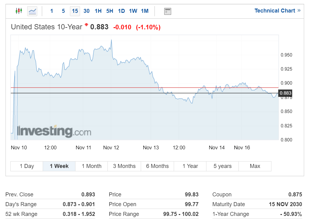 지난주 화이자의 백신 소식에 단기적 변동성을 보였던 미국 국채 금리는 현재 0.883%를 기록 중입니다.