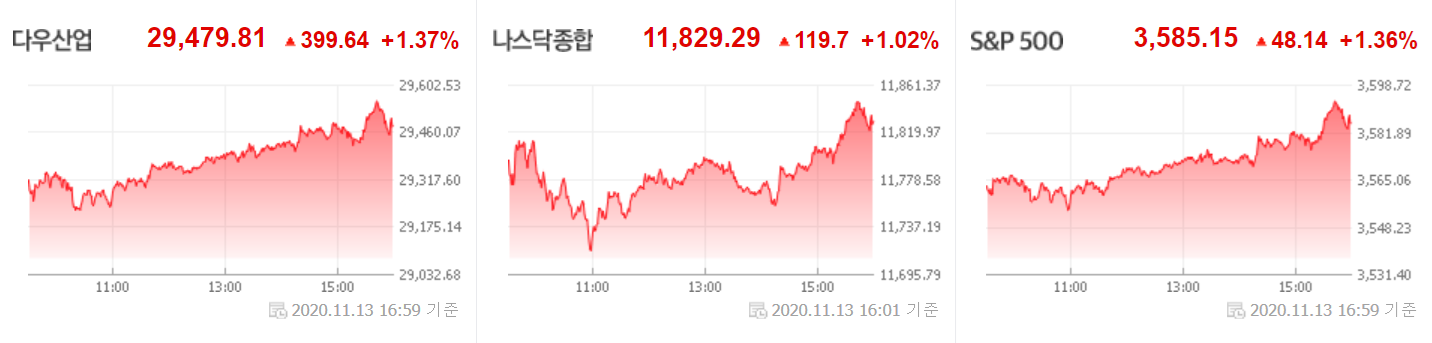현재 미국 증시의 분위기는 백신의 개발로 인해 내년 상반기 부터 경기가 좋아질 것으로 기대하며, 연준 의장 파월도 현재 코로나19로 상황은 좋지 않지만 미국의 경기는 견조한 편이라고 생각하는 것 같습니다. 지난 거래일(11월 13일) 뉴욕 증시는 조만간 백신이 예상보다 빨리 나올 수 있다는 기대감에 장 초반부터 상승하면서 3대 지수 모두 1% 넘게 오르면서 마감했습니다. 또한 이번 주로 예정된 화이자와 모더나의 코로나19 백신에 대한 긴급사용신청이 예정되어 있습니다.