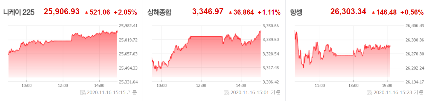 아시아는 어제 역내포괄적경제동반자협정(RCEP)가 타결되었고, 중국의 산업생산, 도시 실업률 등의 호조 및 일본의 3분기 GDP가 21.4% 상승하는 등 훈훈한 분위기 속에 장을 마쳤습니다. 또한 달러 약세 기조에 따른 외국인의 수급이 동아시아 국가인 한국, 중국, 대만 및 일본에 몰린 것도 주요 상승의 원인으로 생각됩니다.