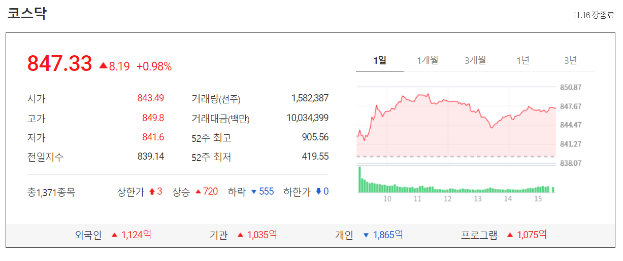 오늘 코스닥은 전장대비 8.19포인트(0.98%)오른 847.33에 장을 마감했습니다.