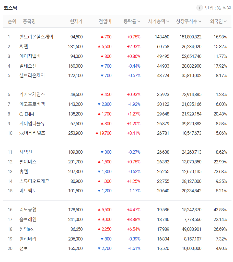 시가총액 상위 종목 중에서는 셀트리온헬스케어(+0.75%), 씨젠(+2.93%), 에이치엘비(++0.86%), 카카오게임즈(+0.93%) 등이 올랐으며 알테오젠(-0.44%), 셀트리온제약(-0.57%) 및 에코프로비엠(-1.92%) 등은 내렸습니다.