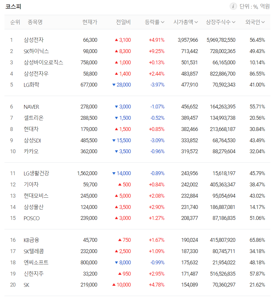 시가총액 상위 종목에서는 삼성전자, SK하이닉스, 삼성바이오로직스, 현대차 등이 올랐고 LG화학, 셀트리온, 삼성SDI, 카카오 등은 내렸습니다.