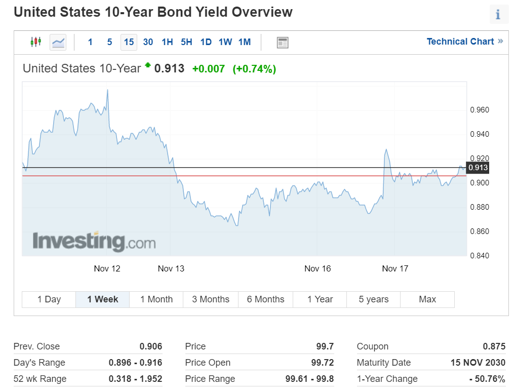 미국 국채 10년 물 금리는 전장 대비 0.74% 오른 0.913을 기록 중입니다.