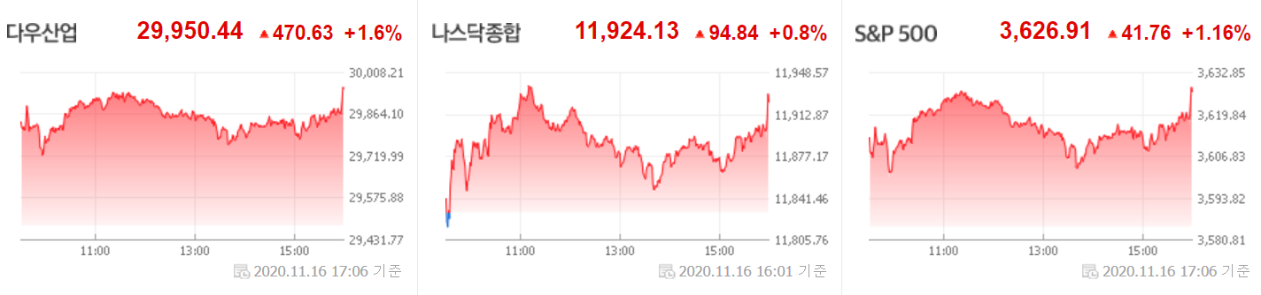 모더나의 백신 개발 소식에 화답한 다우지수는 전 거래일 대비 470.63(+1.6%) 오른 29950.44를 기록, 종가 기준으로는 사상 최고치를 경신하면서 종료됐습니다.