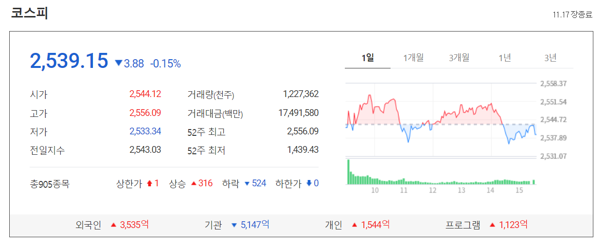 오늘 코스피는 전 거래일 대비 3.88포인트(0.15%) 내린 2539.15에 장을 마감했습니다.