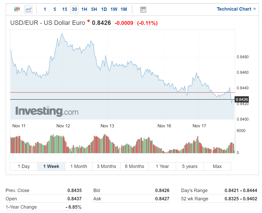 유로화도 강세입니다. 현재 1달러당 0.8426을 기록 중입니다.