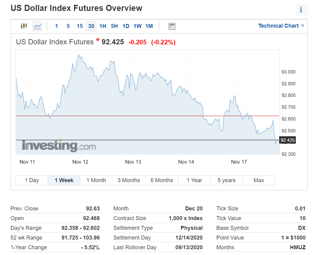 미국 달러 인덱스 선물 거래는 현재 전 거래일 대비 0.22% 내린 92.425포인트를 기록 중입니다.
