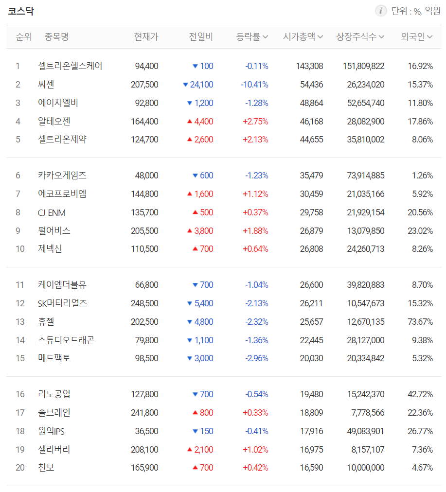 시가총액 상위 종목 중 셀트리온헬스케어(-0.11%), 씨젠(-10.41%), 에이치엘비(-1.28%), 카카오게임즈(-1.23%) 등이 내렸고 알테오젠(+2.75%), 셀트리온제약(+2.13%), 에코프로비엠(+1.12%), CJENM(+0.37%), 펄어비스(+1.88%), 제넥신(+0.64%) 등이 올랐습니다.