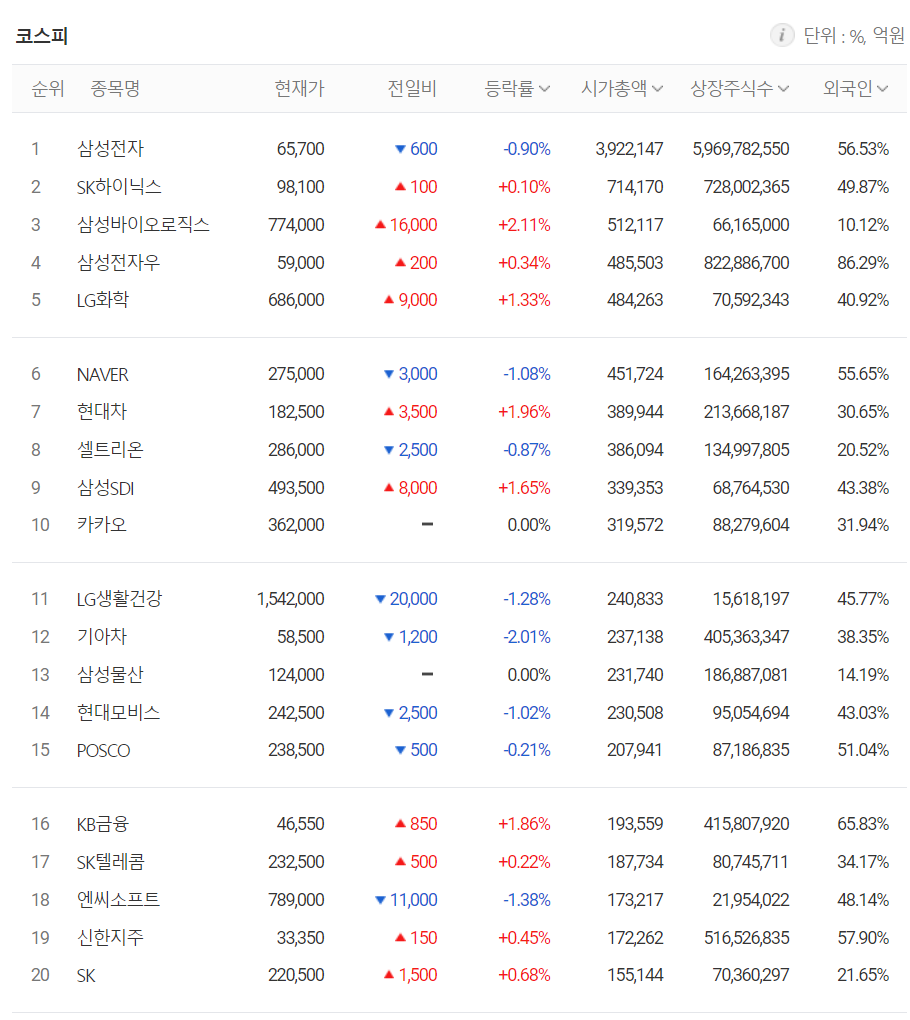 시가총액 상위 종목 중에서는 어제 급등하면서 사상최고가를 기록했던 삼성전자가 -0.90% 내린 65700원에 거래됐고, SK하이닉스(+0.10%), 삼성바이오로직스(+2.11%), LG화학(+1.33%), 현대차(+1.90%), 삼성SDI(+1.65%) 등이 올랐습니다.