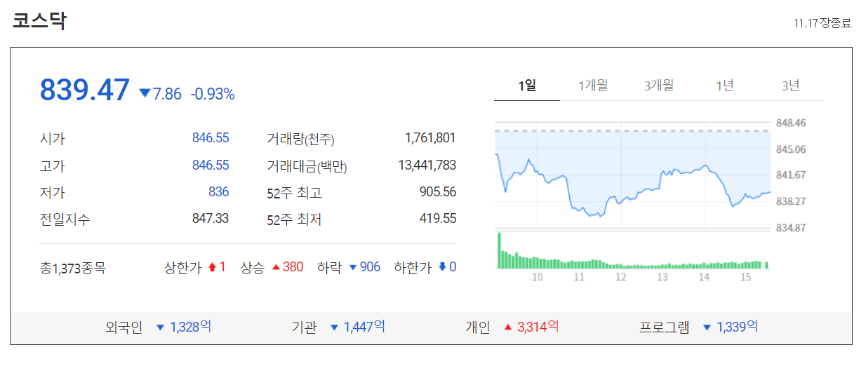 오늘 코스닥은 7.86포인트(0.93%)하락한 839.47에 마무리됐습니다.