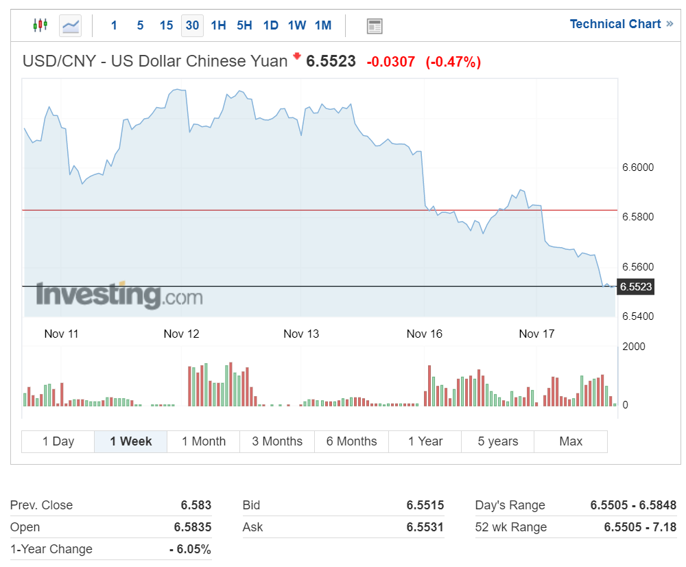 중국도 위안화 강세가 계속되면서 1달러당 6.5523위안을 기록 중입니다.
