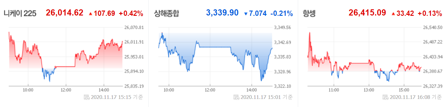 아시아 주요 국들의 증시는 어젯밤 모더나의 백신 개발 소식에 반응하는 듯했으나 중국의 경우 어제의 급등에 따른 차익실현 매물로 약보합에 마감됐습니다.