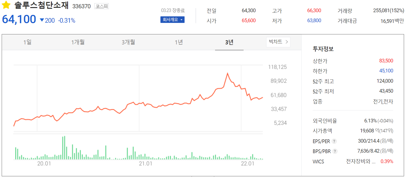3월 23일 장 종료 기준 당사의 주가는 전일보다 0.31% 내린 64,100원에 거래를 마감했습니다. 외국인 비중은 6.13%이며, 시가총액 1조 9,608억 원으로 코스피 시총 기준 147위 종목입니다.