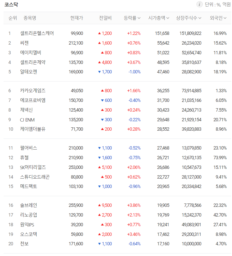 코스닥 시가총액 상위종목 마감 시세 (자료: 다음 금융)