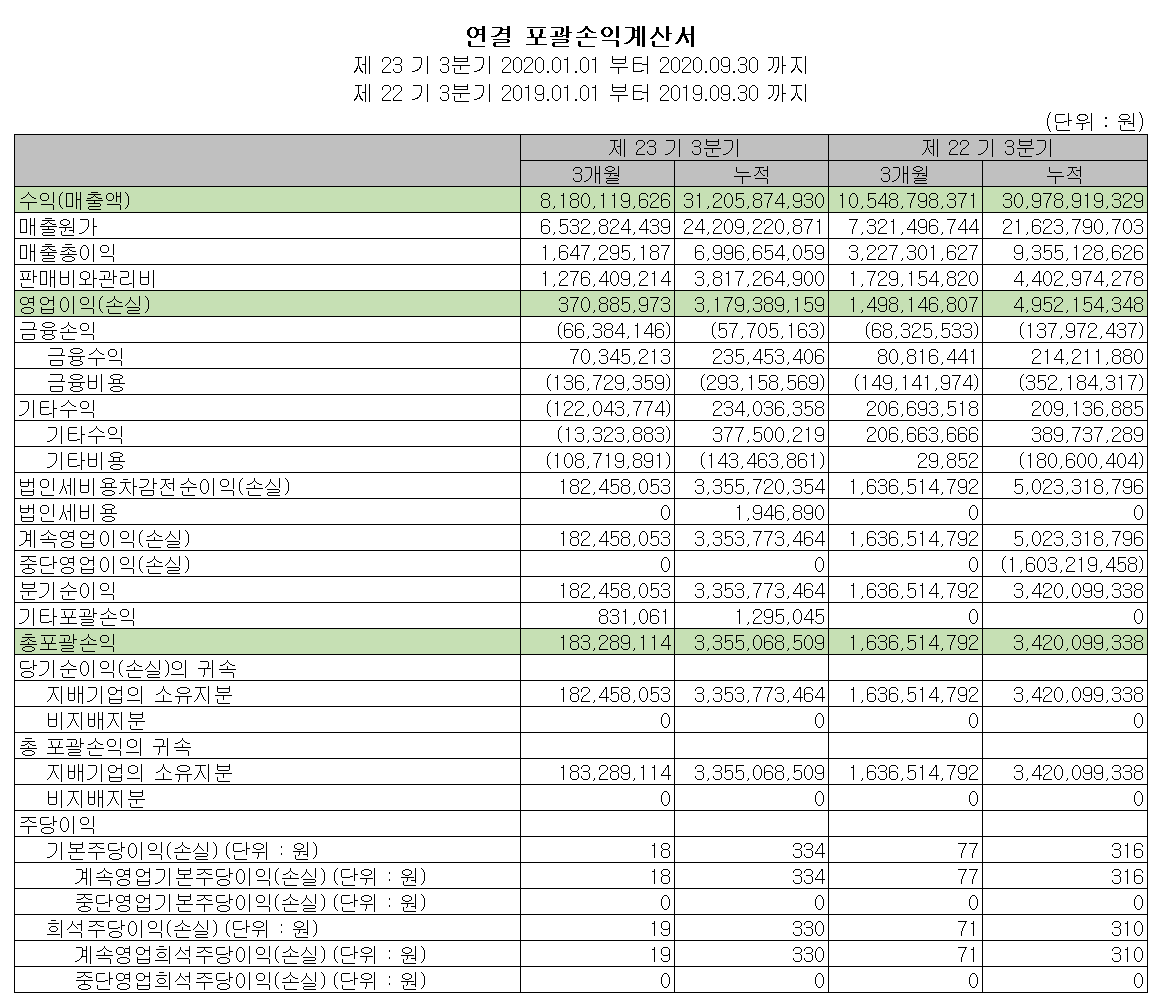 당사는 지난 2020년 3분기 누적 기준 매출액 312억 원으로 전년 동기 대비 0.7% 증가했으나, 영업이익은 31.8억 원으로 35.8% 감소했습니다. 당사의 재고 자산에 대한 손실 충당금이 매출원가에 반영된 원인으로 보입니다.