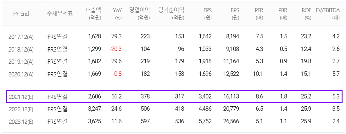 2021년 연간 예상실적에서는 매출액 2,606억 원으로 56.2% 증가했고, 영업이익은 378억 원으로 107.7% 증가했습니다. 지난 상반기 주로 국내 고객사의 투자에 따른 수요 증가로 실적이 증가했고, 하반기에는 Micron향 신규 수요가 예상되며 특히 올해부터는 기업들의 환경이슈가 대두되면서 당사의 유해가스 제어장치 수요도 ESG 트렌드와 함께 성장할 것으로 전망하고 있습니다.