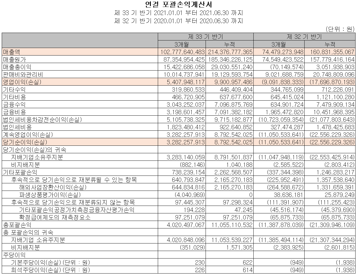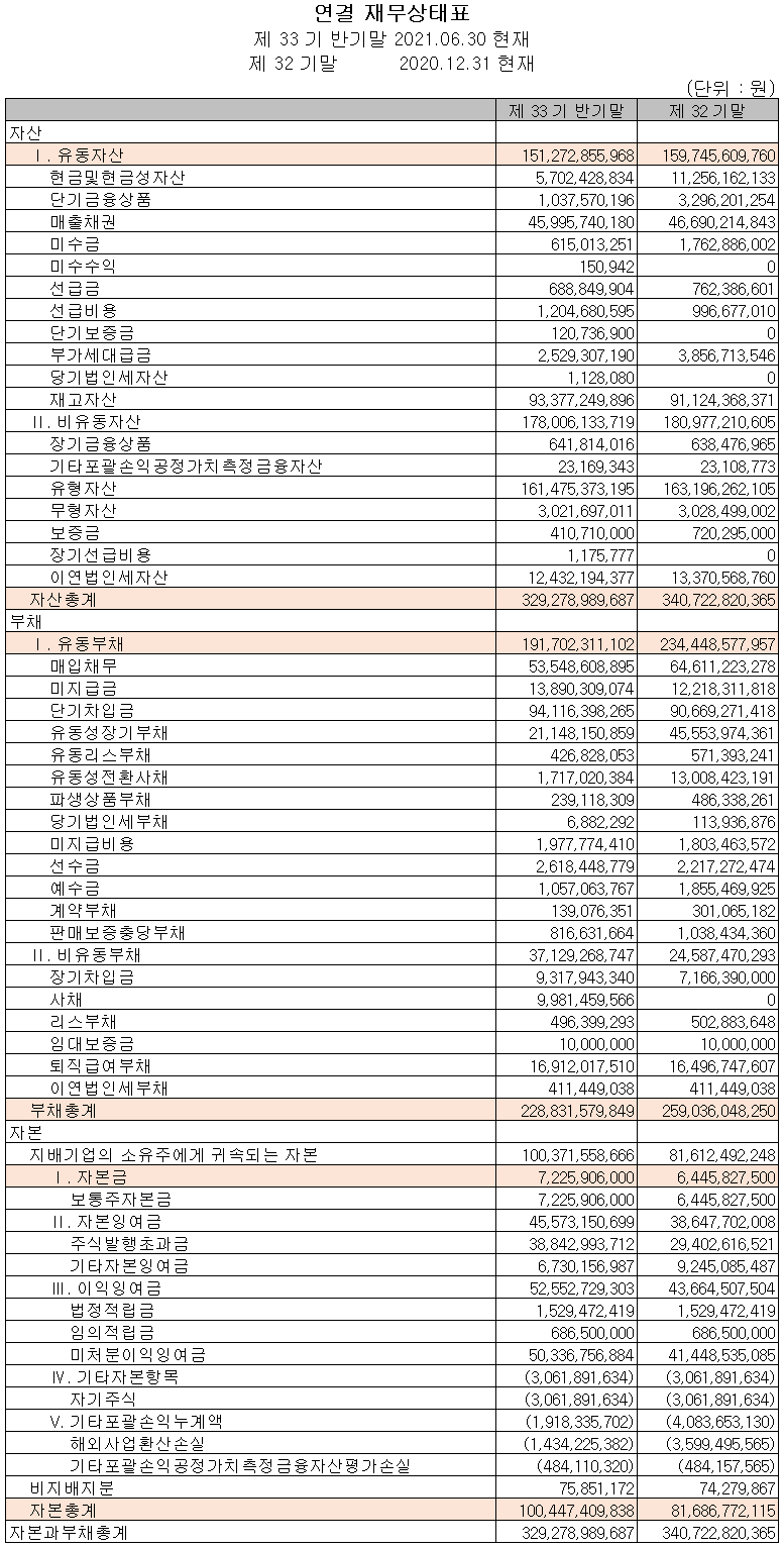 2021년 상반기 말 기준 자산총계는 전기 말보다 3.4% 감소한 3,293억 원이며, 부채총계는 11.7% 줄어든 2,288억 원입니다. 자본총계는 주식발행초과금(전환사채 중 전환 청구된 금액)이 증가했고, 순이익에 따른 잉여금이 증가하면서 188억 원이 증가한 1,004억 원을 기록했습니다.
