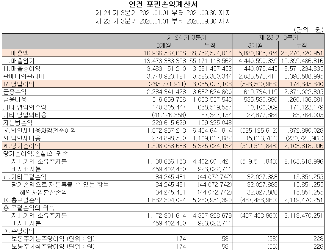 지난 3분기 영업활동 현금흐름에서는 2.6억 원의 현금이 유입되었으며, 투자활동에서는 종속기업 및 관계기업 투자주식을 취득하였고, 유무형 자산을 취득하였으나 금융상품의 처분으로 18억 원의 현금이 유입되었습니다. 재무활동에서는 장단기 차입금을 차입하고, 당기 부채를 상환하면서 120억 원의 현금이 유입되었습니다. 2021년 3분기 말 기준 현금성 자산은 전년 동기 대비 159억 원이 늘어난 353억 원을 보유하고 있습니다.